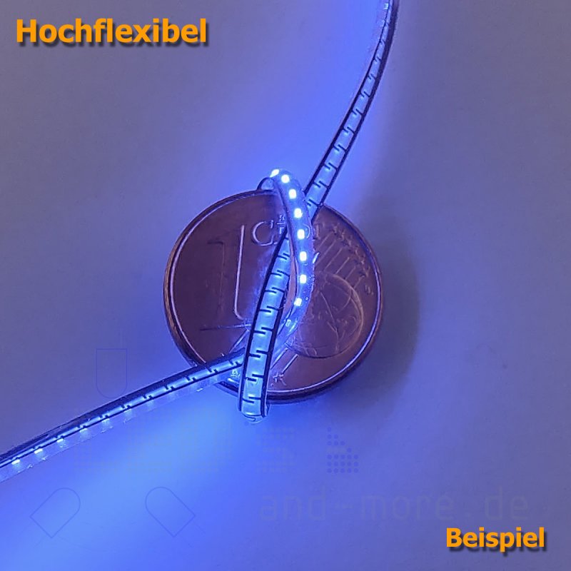 Durch die hohe LED-Dichte wirkt es wie ein durchgehendes Lichtband. Hochflexibel lässt es sich hervorragend auch um schmale Ecken verlegen. Perfekt für den Modellbau oder für Beleuchtungshighlights in der Dekoration.